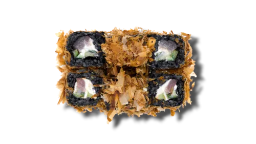 рис, нори, чернила каракатицы, сыр творожный, тунец, огурец свежий, стружка тунца