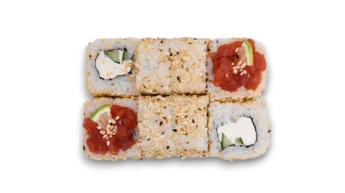 рис, нори, тунец, сыр творожный, огурец свежий, соус чили шрирача, лайм, кунжут