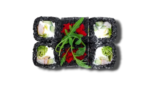 рис, нори, чернила каракатицы, сыр творожный, креветка, салат айсберг, огурец свежий, рукола, масаго красная