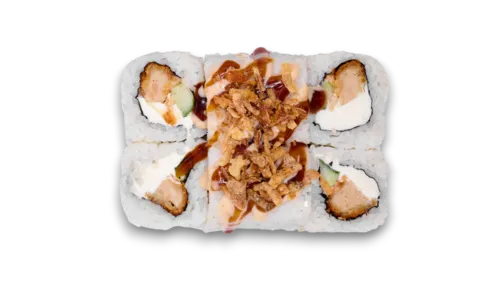 рис, нори, сыр творожный, стрипсы куриные, огурец свежий, соус ореховый, соус унаги, лук фри