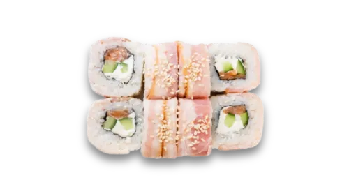 суши-сендвич с лососем, суши-сендвич с беконом, ролл Филадельфия темпура, ролл Темпурный с беконом